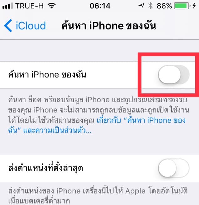 โดยเข้าไปที่ ตั้งค่า > และไปที่ช่องค้นหา พิมพ์ว่า Find My iPhone จากนั้นให้ทำการปิด[/vc_column_text][vc_single_image image=”16472″ img_size=”full” alignment=”center” style=”vc_box_shadow_border” lazy_loading=”true” css=”.vc_custom_1498606324878{padding-top: 10px !important;padding-right: 10px !important;padding-bottom: 10px !important;padding-left: 10px !important;background-color: #f7f7f7 !important;}”][vc_empty_space][vc_column_text]